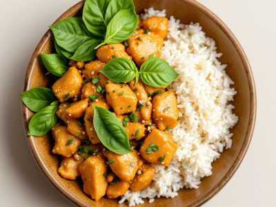 This vegetarian Thai Basil Chicken with Jasmine Rice is rich in plant-based protein from tofu and packed with vitamins from fresh vegetables like bell peppers and long beans. The use of Thai basil adds antioxidants and anti-inflammatory compounds. The dish is low in saturated fat and cholesterol, making it heart-healthy. Jasmine rice provides energy-boosting complex carbohydrates. The meal also offers potassium, vitamin C, iron, and fiber, supporting overall wellness.